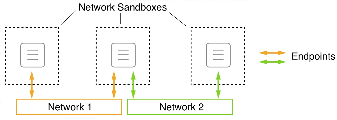 - 하나의 네트워크 샌드박스 안에는 여러 개의 엔드포인트가 있을 수 있어요. 즉, 하나의 샌드박스 안에 있는 컨테이너는 네트워크에 전혀 연결되지 않거나, 여러 네트워크에 동시에 연결될 수 있어요. 가령, 세 개의 샌드박스 중 하나는 엔드포인트를 통해 두 개의 네트워크에 동시에 연결된 상태일 수 있죠.