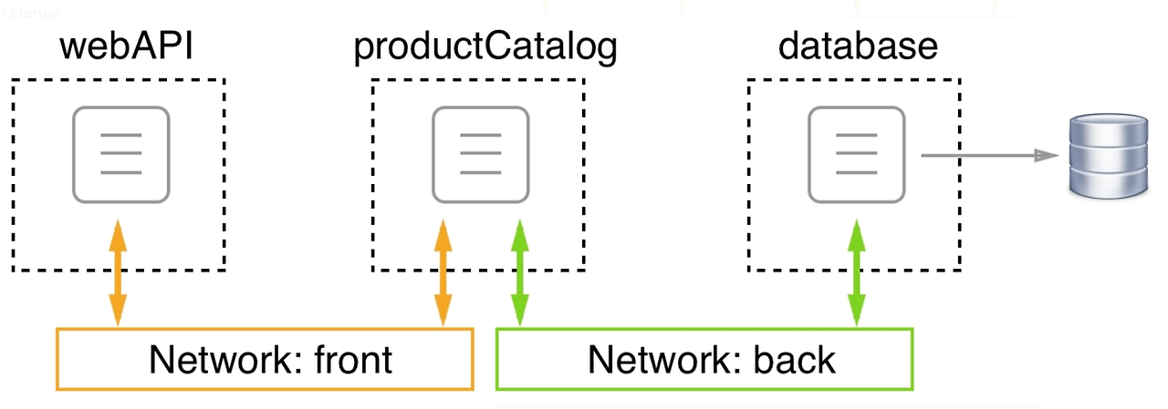 우리에게 웹 API, 제품 카탈로그, 데이터베이스 세 개의 서비스로 이루어진 애플리케이션이 있다고 해요. 이때 우리는 웹 API가 제품 카탈로그와는 통신할 수 있지만, 데이터베이스와는 통신하지 못하게 하고 싶어요. 반면, 제품 카탈로그는 데이터베이스와도 통신할 수 있으면 좋겠죠. 이걸 해결하는 방법 중 하나는 웹 API와 데이터베이스를 서로 다른 네트워크에 두고, 제품 카탈로그는 두 네트워크에 모두 연결하는 거예요. 이렇게 하면 원하는 대로 통신 구조를 설정할 수 있어요.
