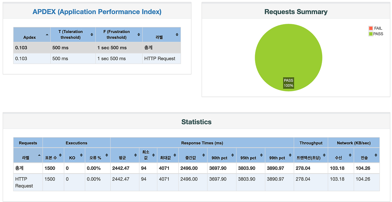 ms 기준이며 1500개의 스레드일 때 3500~4000ms 시간때에 스레드의 응답시간이 제일 많이 분포되어 있는것을 확인할수 있는 그래프입니다.