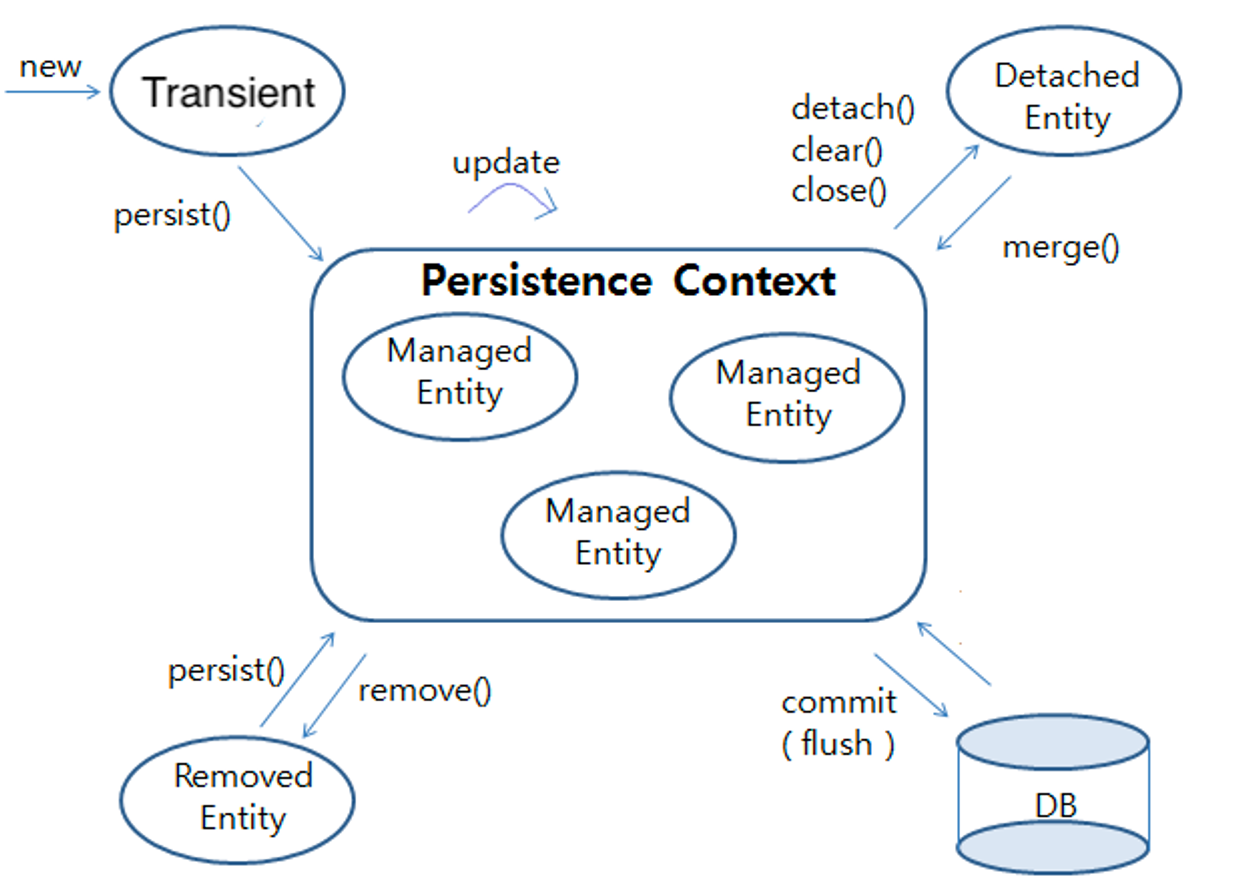 .persist(entity) : 비영속 Entity를 EntityManager를 통해 영속성 컨텍스트에 저장하여 관리되고 있는 상태로 만듭니다
