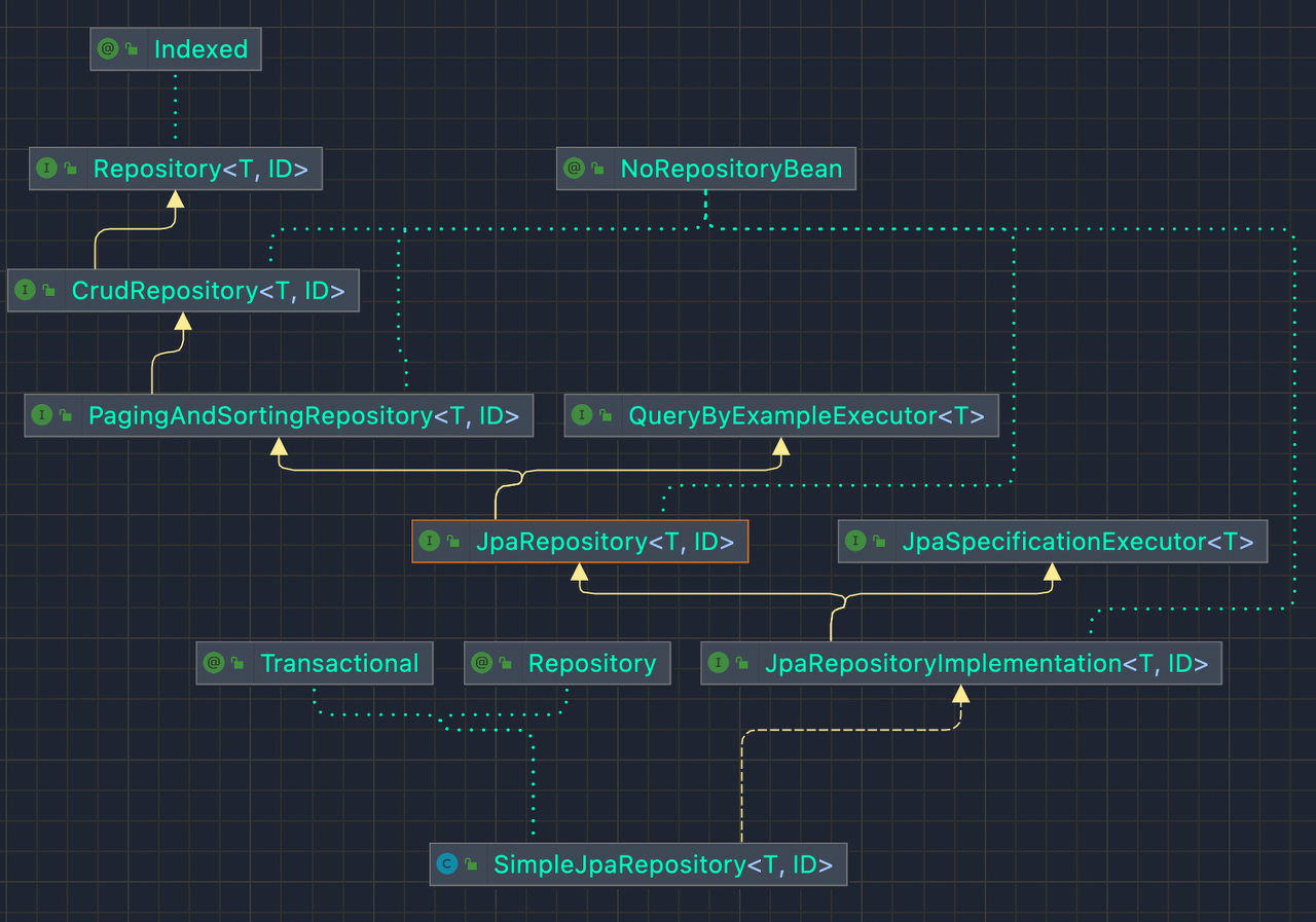 Repository 인터페이스는 Hibernate와 같은 JPA구현체를 사용해서 구현한 클래스를 통해 사용됩니다.