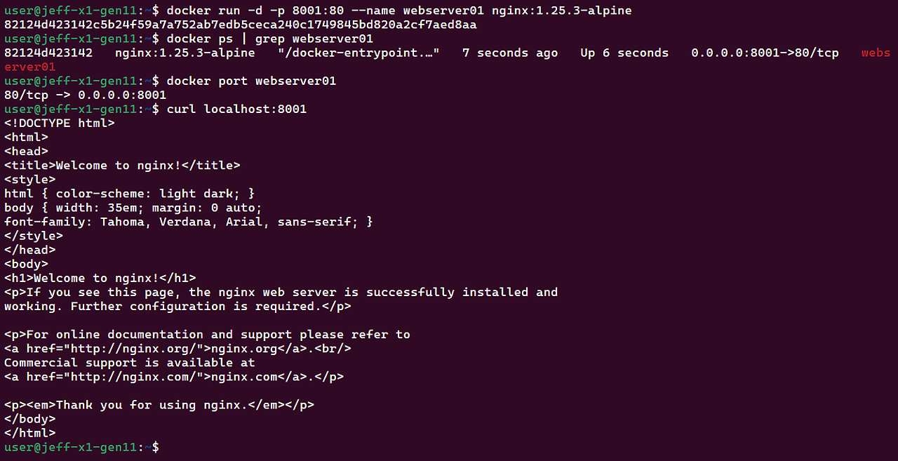 docker run -d -p 8001:80 --name webserver01 nginx:1.25.3-alpine