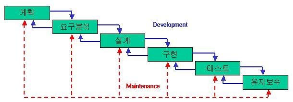 - 소프트웨어 개발주기(SDLC, Software Development Life Cycle) 중 폭포수(waterfall) 개발 방식
