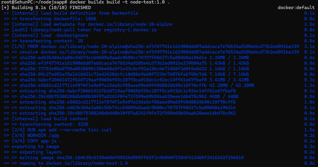 docker buildx build -t {이름} :1.0 . # 1.0 태그를 추가하여 node-test라는 이미지를 빌드