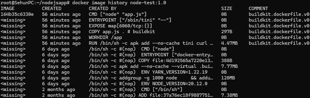 docker image history {이름} :1.0 # 1.0으로 태그 추가한 이미지의 Dockerfile history