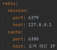 먼저 위와 같이 application.yml 또는 application.properties에서 사용할 port 번호와 host를 설정하자. 아직 local 개발 중이므로 cache - host를 도커 머신 IP로 지정해 줬다.