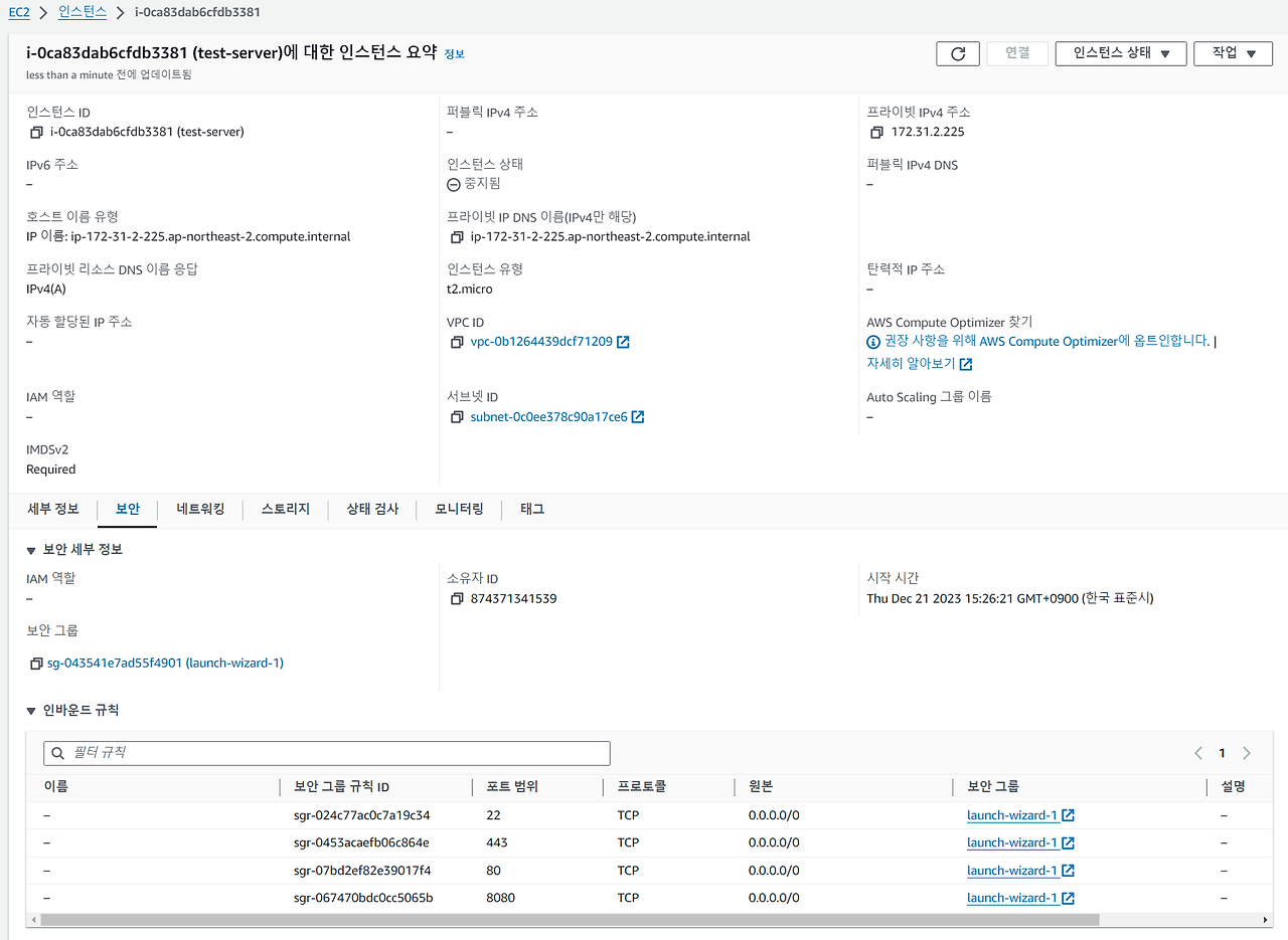 - 해당 인스턴스에 연결된 보안그룹에서 8080 포트를 open 하고 있는지 확인