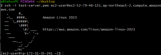 ssh -i {비밀키} ec2-users@ { 퍼블릭 ipv4 DNS }