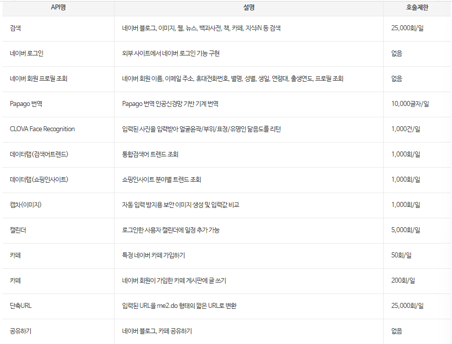 네이버 오픈 API 목록 NAVER Developers - API 소개 네이버 오픈API 목록 및 안내입니다. 네이버 오픈 API 목록 API명 설명 호출제한 검색 네이버 블로그, 이미지, 웹, 뉴스, 백과사전, 책, 카페, 지식iN 등 검