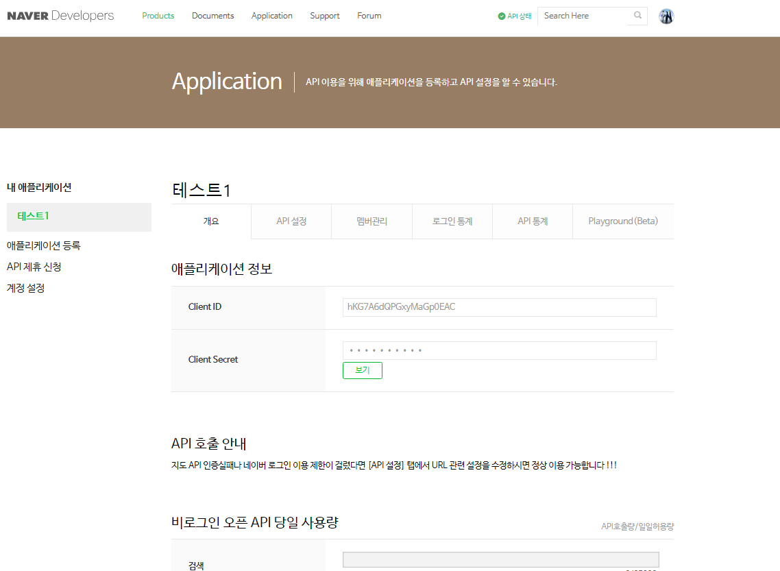 2. Client ID 랑 Client Secret(비번) 을 받고 이것일 사용 하여 Open API 요청을 합니다.