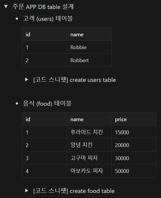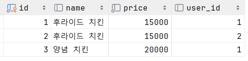 음식 : 고객 = N : 1 관계를 표현해보겠습니다.