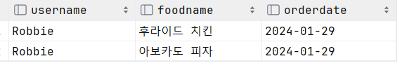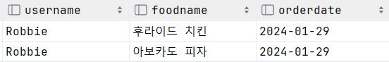 'Robbie 가 주문란 음식 정보를 food 테이블 기준으로 조회'