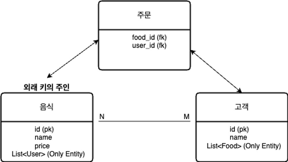 - 1 대 N 관계에서 양방향 관계를 맺으려면 음식 Entity를 외래 키의 주인으로 정해주기 위해 고객 Entity에서 mappedBy 옵션을 사용해야 하지만 @ManyToOne 애너테이션은 mappedBy 속성을 제공하지 않습니다.