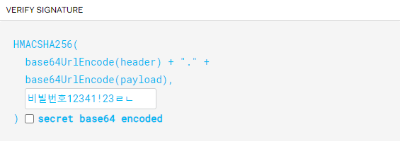 시그니처의 구조는 (헤더 + 페이로드)와 서버가 갖고 있는 유일한 key 값을 합친 것을 헤더에서 정의한 알고리즘으로 암호화를 한다.