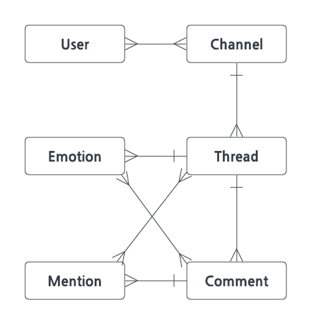 - Comment : 쓰레드내 댓글로 쓰레드와 다대일 관계를 가지며 이모지, 멘션과도 관계를 가진다.