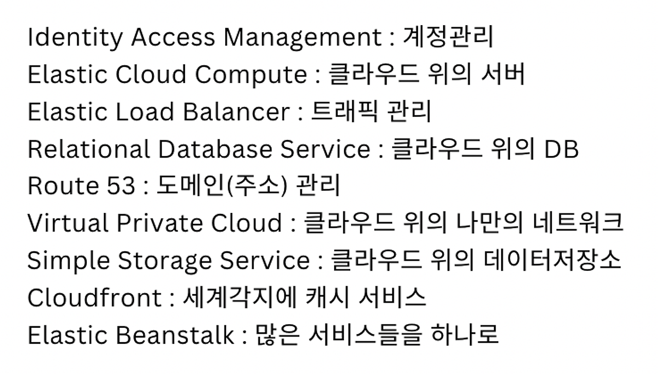 - 컴퓨팅: EC2 (Elastic Compute Cloud), Elastic Beanstalk 등