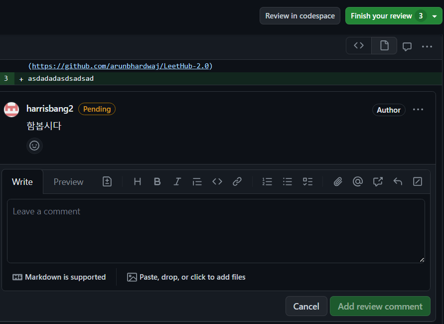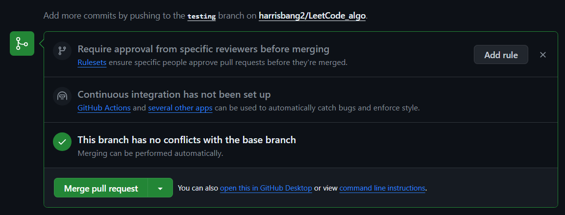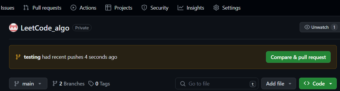 다른 branch 에서 push 하면 뜸 (안뜰 때는 Pull requests 에서 수동으로).