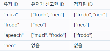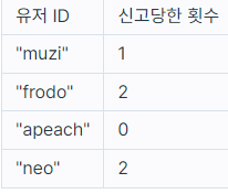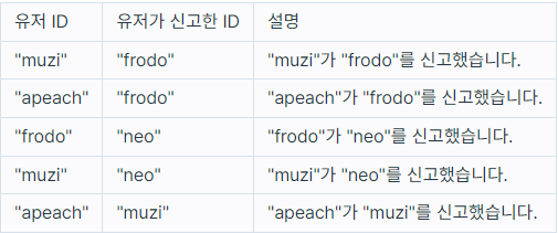 위 예시에서는 2번 이상 신고당한 "frodo"와 "neo"의 게시판 이용이 정지됩니다. 이때, 각 유저별로 신고한 아이디와 정지된 아이디를 정리하면 다음과 같습니다.