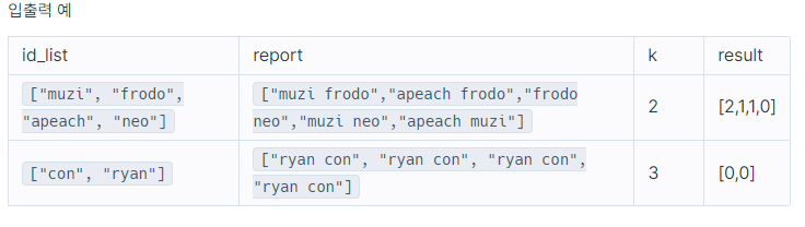 다음은 전체 유저 목록이 ["muzi", "frodo", "apeach", "neo"]이고, k = 2(즉, 2번 이상 신고당하면 이용 정지)인 경우의 예시입니다.